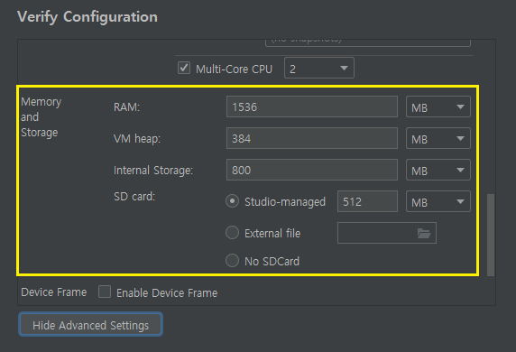 가상 디바이스 설정 화면이 뜨면 하단에 있는 'Show Advanced Settings'라는 버튼이 있습니다. 이 버튼을 클릭합니다.