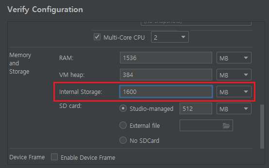 그래서 좀 더 근본적인 문제 해결을 위해서는 애뮬레이터의 저장 공간을 늘려 주면 되지 않을까 생각했습니다.