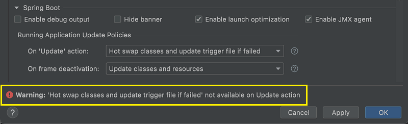 Warning: ‘Hot swap classes and update trigger file if failed‘ not available on Update action